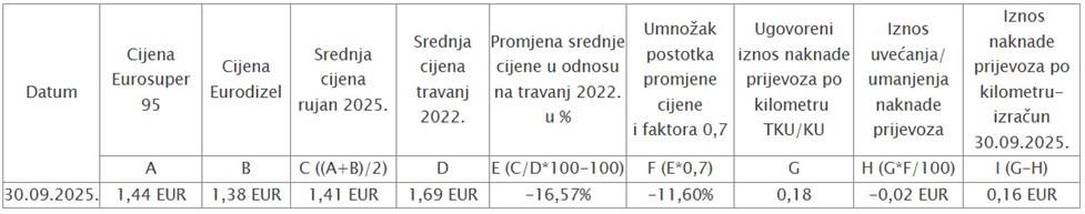 Slijedom navedenog, ugovorena visina naknade troškova prijevoza po kilometru umanjuje se za 11,60% (16,57% x 0,7) te od 1. listopada 2025. godine iznosi 0,16 eura.